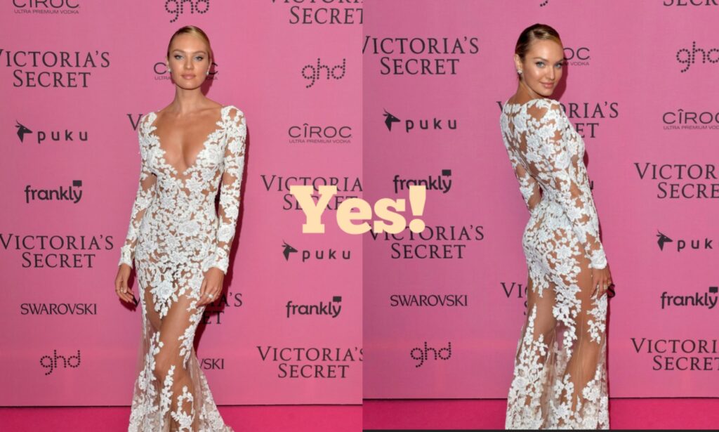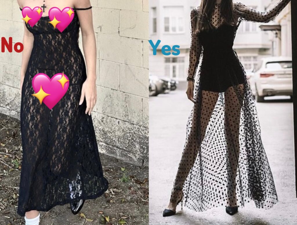 Transparent fashion is “teasable fashion.” Which means that even if the dress is see through what you are really doing is that you are playing with the silhouette and the shaping of your body vs. playing with how much skin you can show off. If something is completely sheer from head to toe than cover the intimate details of your body in a classy way – with lines within the dress or sparkle underneath the dress.
