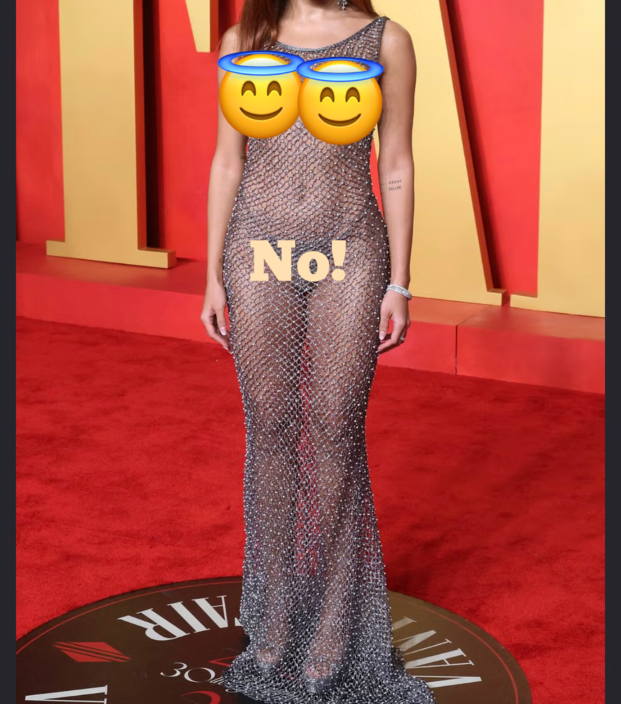 So back to fashion…it’s “forbidden” for a women to show her body, “yadayayaya” and so what has happened is that more celebrities (in order to get more clicks and views and make the movies that they are in stand out more and hopefully bring in a larger audience) they have started to wear less and less and less on the red carpet. And sometimes wearing less hasn’t been in the most fashionable way. What happens then is that younger girls replicate this without both sides knowing exactly what their doing.